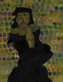 1906 Dotty diva.b Dotty diva quirky drawing of large lady in black, set against fingerprint background