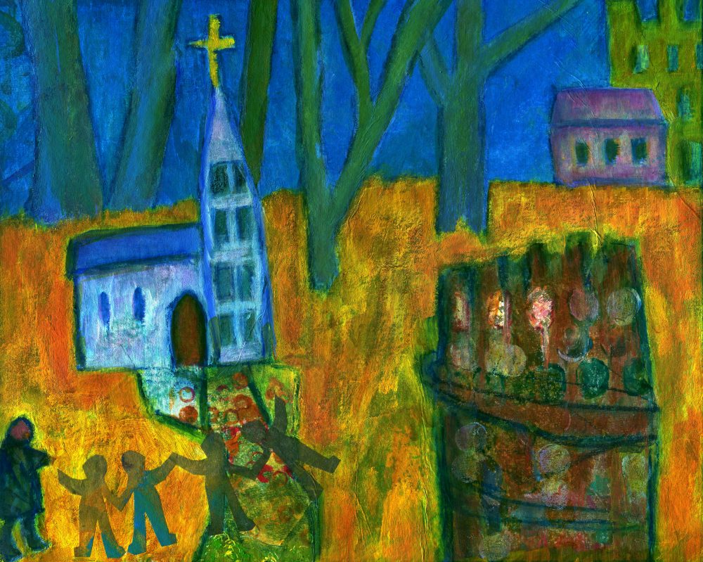 An imagined landscape by Catherine Redmayne named for the circular tower that appeared – and even has a ghostly figure inside it!