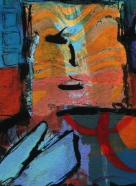 2003-Gardener-with-blue-flo Gardener with blue flowers – detail a figure in patterned clothing stands almost camouflaged in a garden