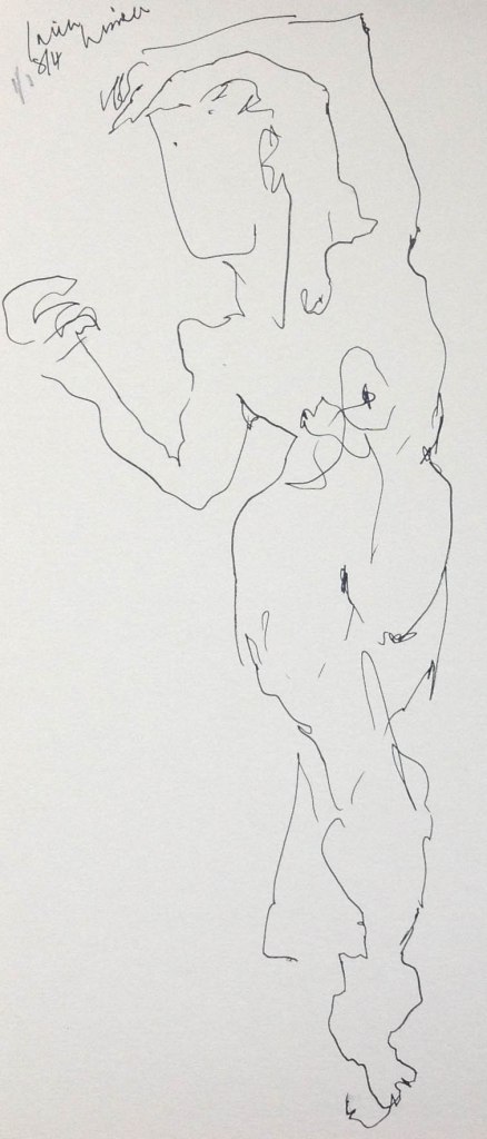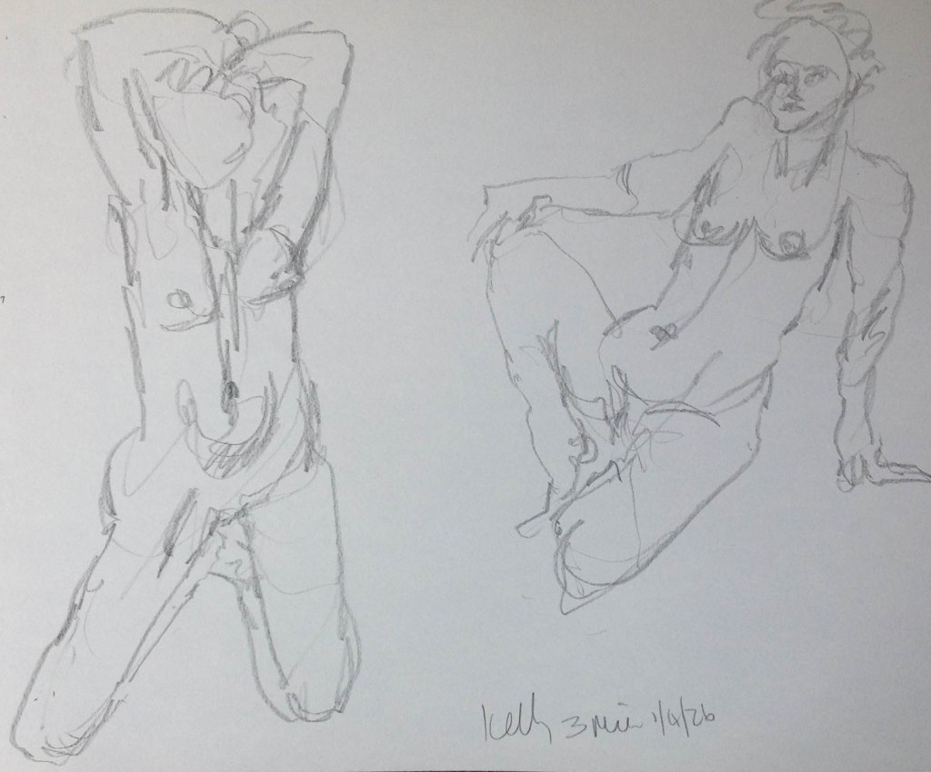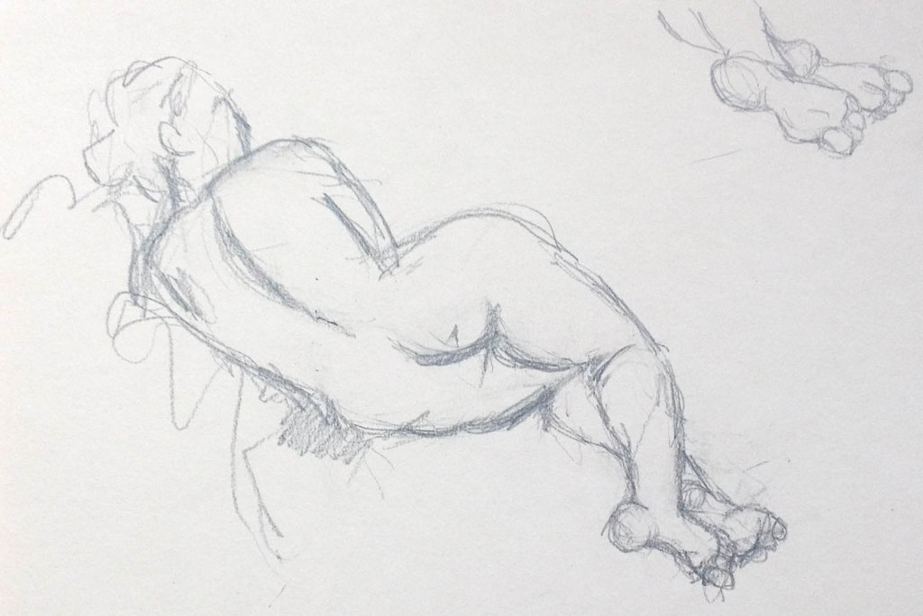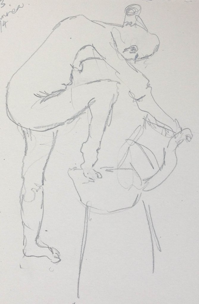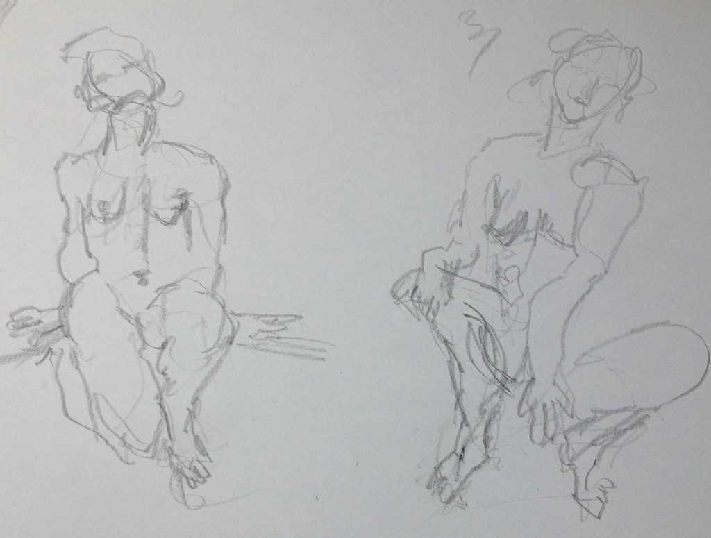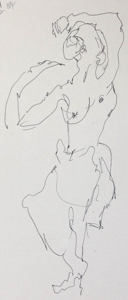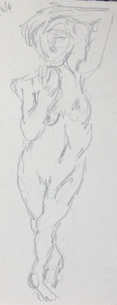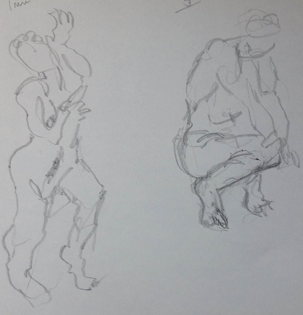 More of the excellent sessions from DrawBrighton – don’t judge the marvellous models from my drawings! Especially when ‘drawing blind’ in some 1-minute poses it is easy to misplace or mis-size body parts! The model usually does 5×1-minute, 5×3-minute, 2×10-minute and 1×20-minute poses. The hour speeds by.