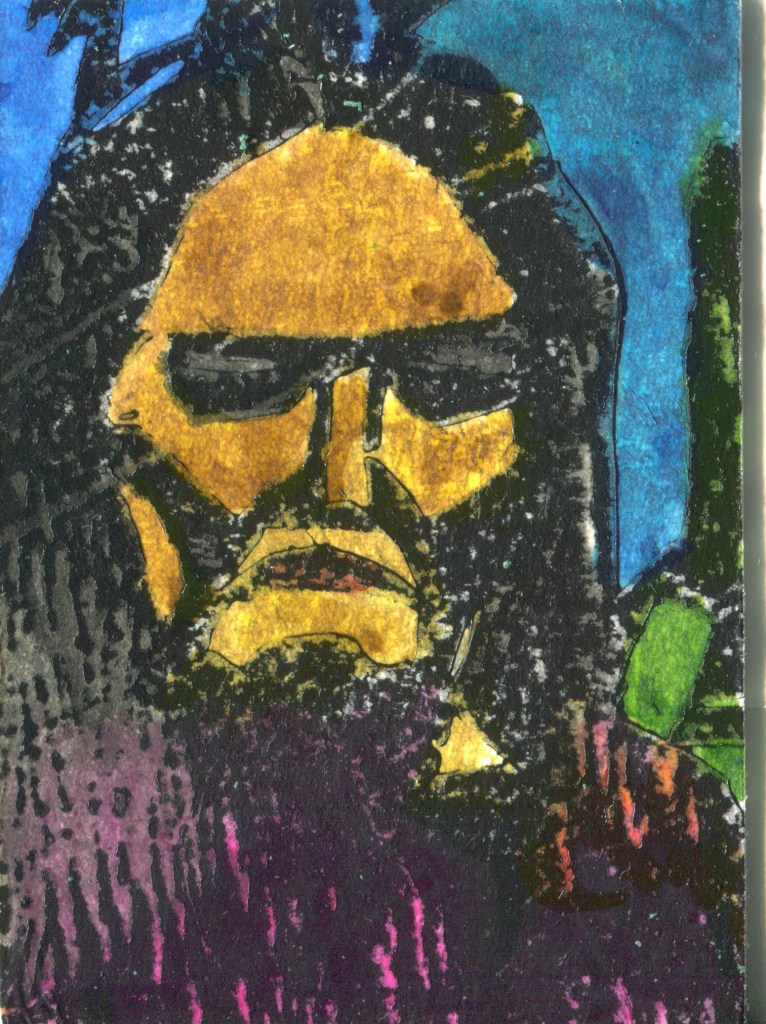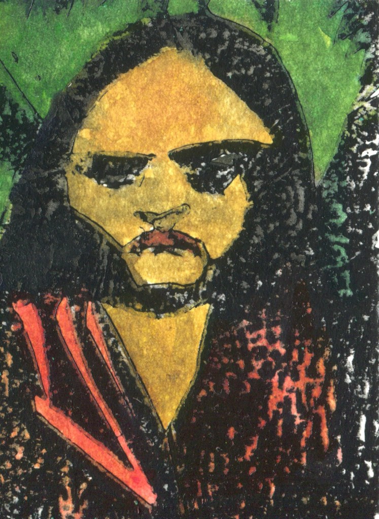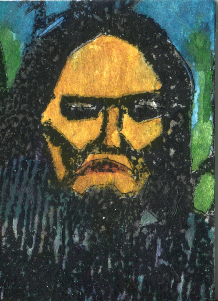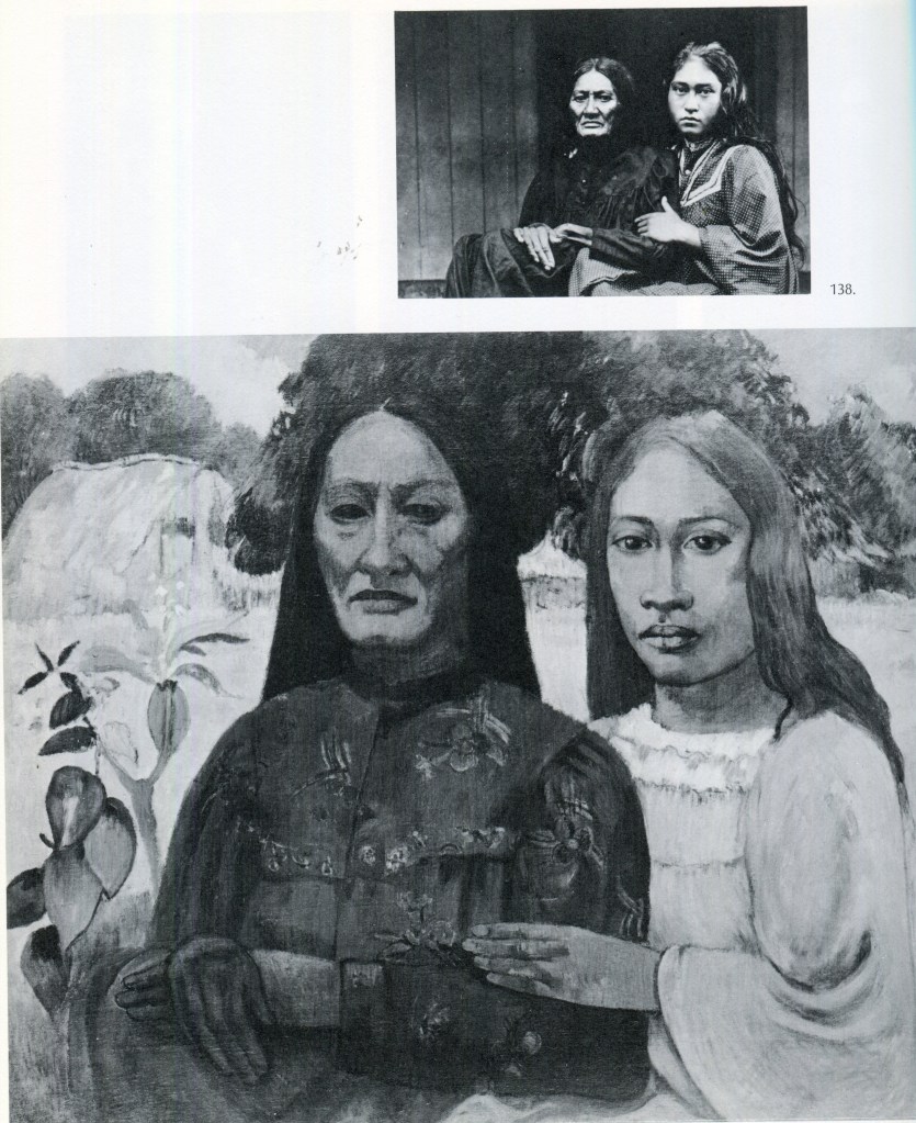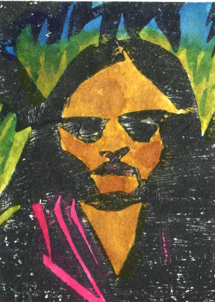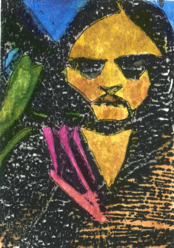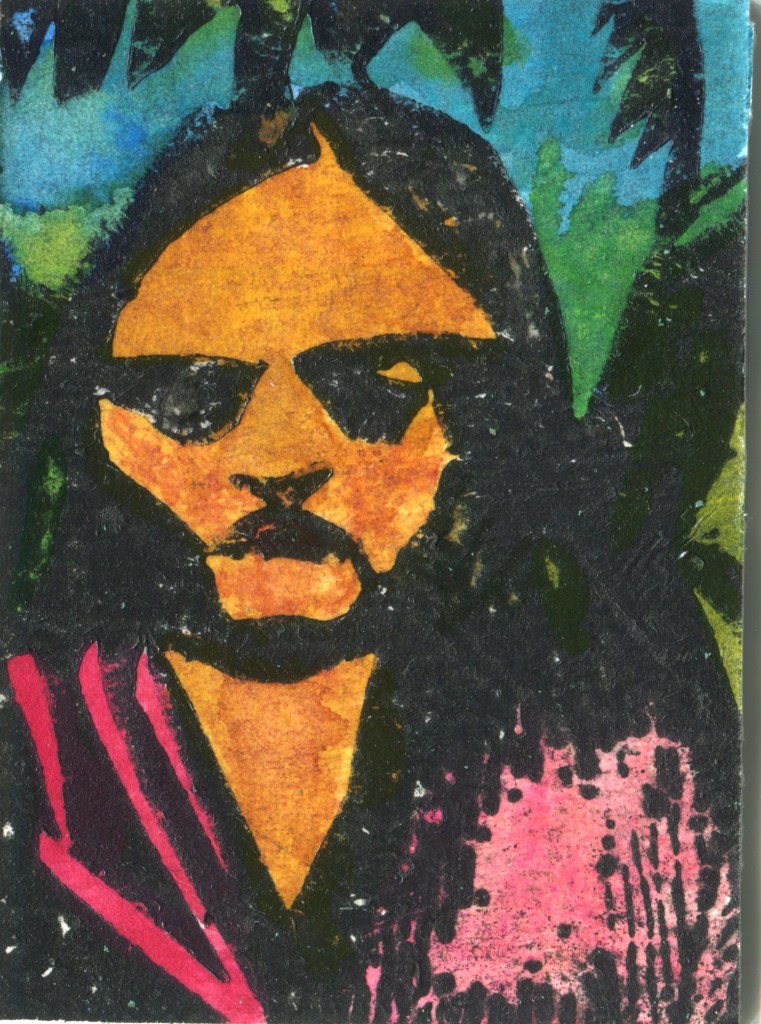 I chose Gauguin and found I still had a large linocut based on a photo Gauguin used for his painting of two women (included in a marvellous book The Painter and the Photograph by Van Deren Coke) so I did some backgrounds and printed one of the faces onto each ATC.