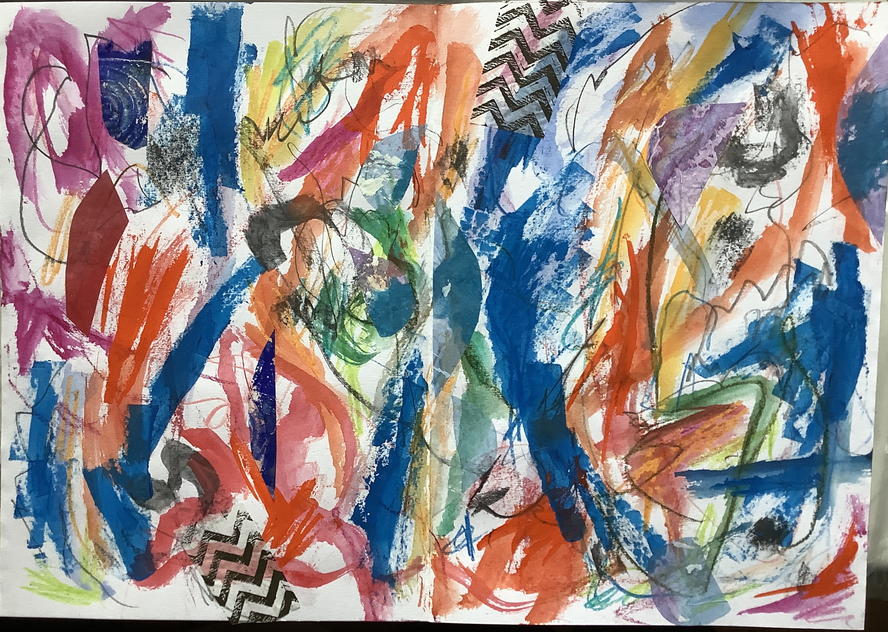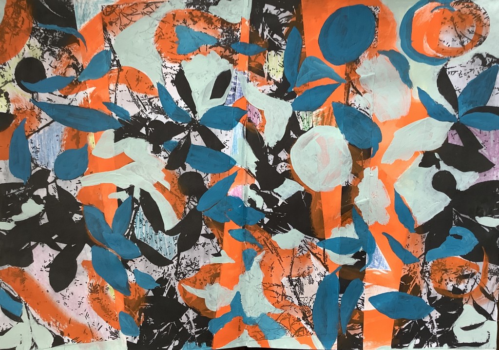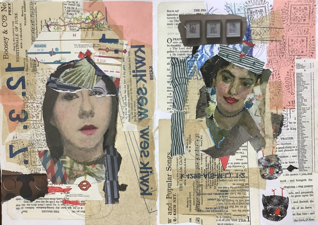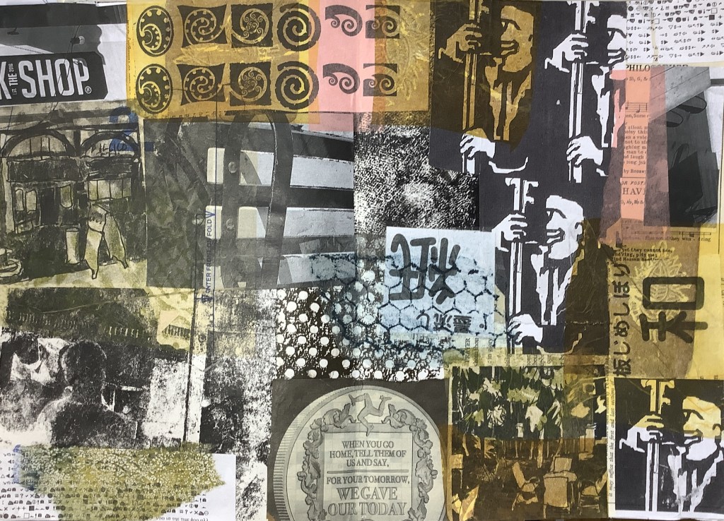 Here are the two collages I made for this short workshop. The under-layer is random scraps of ‘stuff’ to make a decorative base. You can’t see a lot of it remaining in the first one but the scraps are outlined with smudged pencil. The second one was done with coloured papers by Lynn but I didn’t have any so I used pictures torn from a Food magazine from Waitrose.