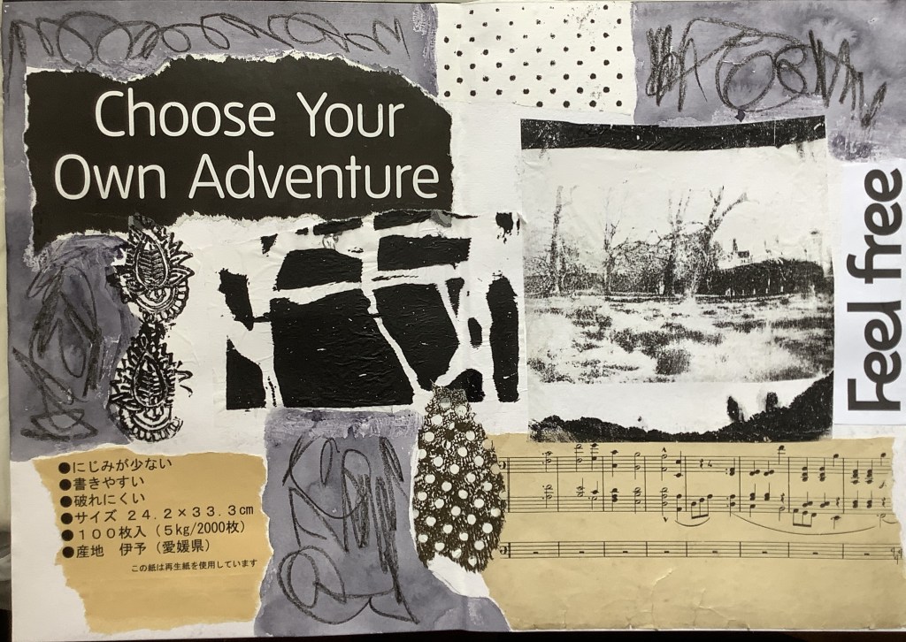 I have been participating in this: 10 artists’ lessons and a Facebook page to show my results. Not everyone who was signed up posted their work which was a shame as it was nice to see what other people made of the demos. Here are the pieces I posted which I did in my A4 concertina sketchbook to keep them in one place. One demo was intended to be folded into a minibook and another was to make a triptych but otherwise it was okay done this size and the paper of the book is surprisingly resilient to gesso, ink, glue etc.