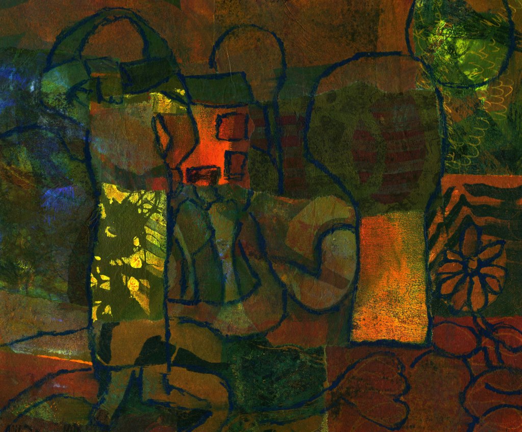 I love this gloomy piece which evolved under my eyes. My visual memory was jerked by the beginnings of the hunched up figure and I found the image I recalled in a book about Gauguin (hero!) with a photo of a Peruvian mummy. I have always loved the poem by Stevie Smith – hence the title.
