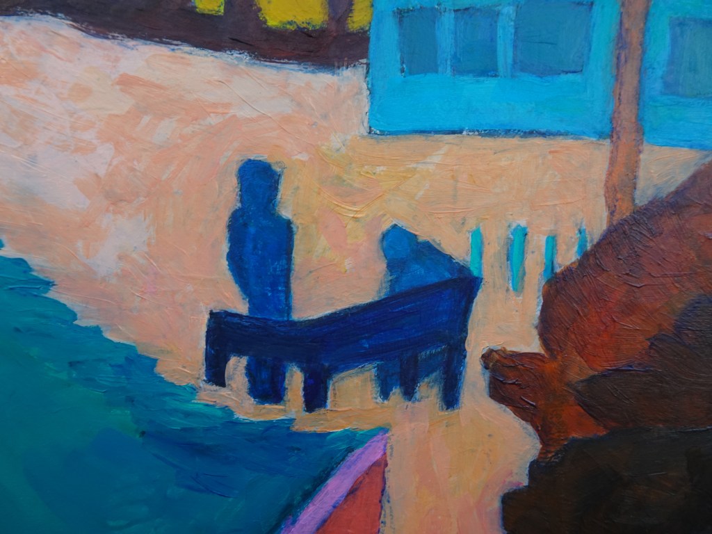 One of a series of interpretations of this view. Cheerful – maybe a bit lurid! – inviting for a cooling drink. For sale. 30x30cm panel, varnished and ready to frame.