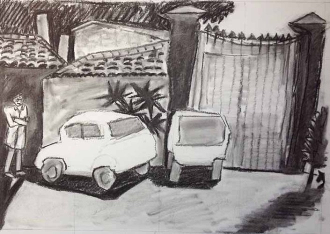 Charcoal drawing developed from a mini sketch done on site. There is our ‘leader’ Gordon a bit peeved everyone is late. There was no way to see the reportedly lovely garden and chateau behind the wall but the village had lots of delights and far-reaching views. Image size 17.5×12.5 inches.
