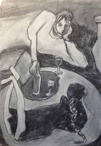 An imagined subject drawn in charcoal. The cut off elements add to the overall feeling of movement. There is a theme of echoes and a struggle to balance the elements in the picture. As often happens, a painting was done based on the drawing but it didn’t have the same satisfaction for me. Image size 15×11 inches.
